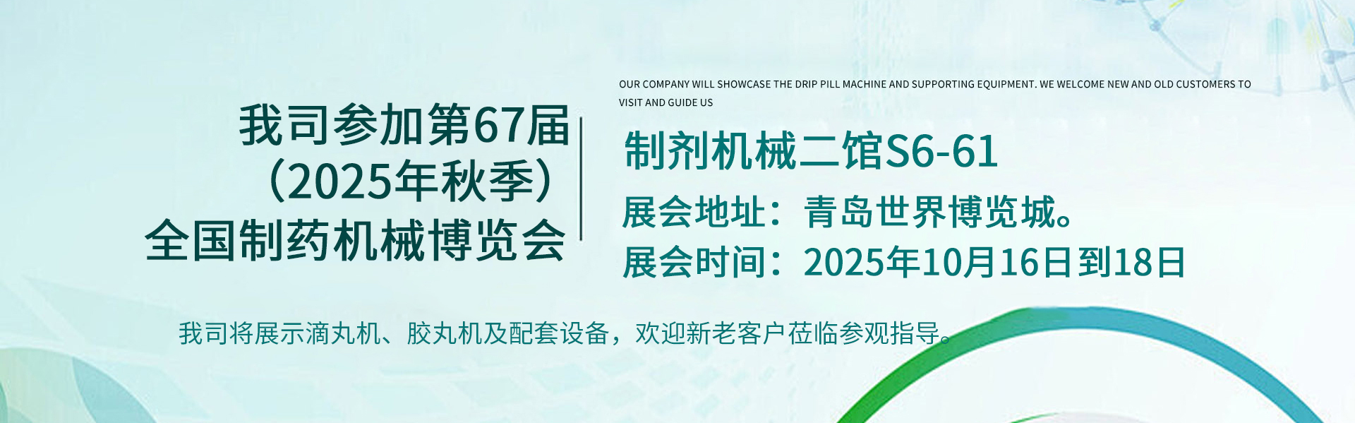 我司參加第65屆(2024年秋季)全國(guó)制藥機(jī)械博覽會(huì), 展位號(hào): 制劑機(jī)械二館10-16 展會(huì)時(shí)間:202...